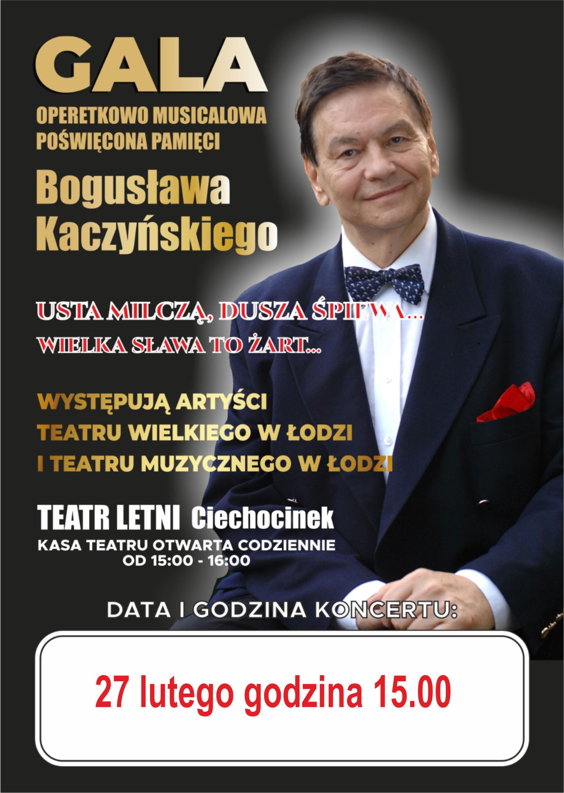 Gala poświęcona pamięci Bogusława Kaczyńskiego. Wystąpią artyści Teatru Wielkiego i Teatru Muzycznego w Łodzi, którzy zaprezentują m.in. arie „Usta milczą, dusza śpiewa…” oraz „Wielka sława to żart…”. Bilety do kupienia w kasie teatru (codziennie od 15:00 do 16:00).