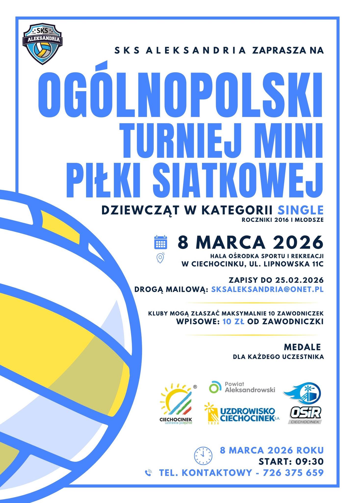 SKS Aleksandria ma zaszczyt zaprosić młode siatkarki na wyjątkowe sportowe wydarzenie w Ciechocinku! To idealna okazja, aby sprawdzić swoje umiejętności, poczuć ducha rywalizacji i przede wszystkim świetnie się bawić!KLUCZOWE INFORMACJE:Kategoria: SINGLE (dziewczęta, roczniki 2016 i młodsze)Kiedy: 8 marca 2026 r. (niedziela)Start: godzina 09:30Gdzie: Hala OSiR Ciechocinek, ul. Lipnowska 11CWPISOWE I ZGŁOSZENIA:Koszt: tylko 10 zł od zawodniczki!Limit: […]