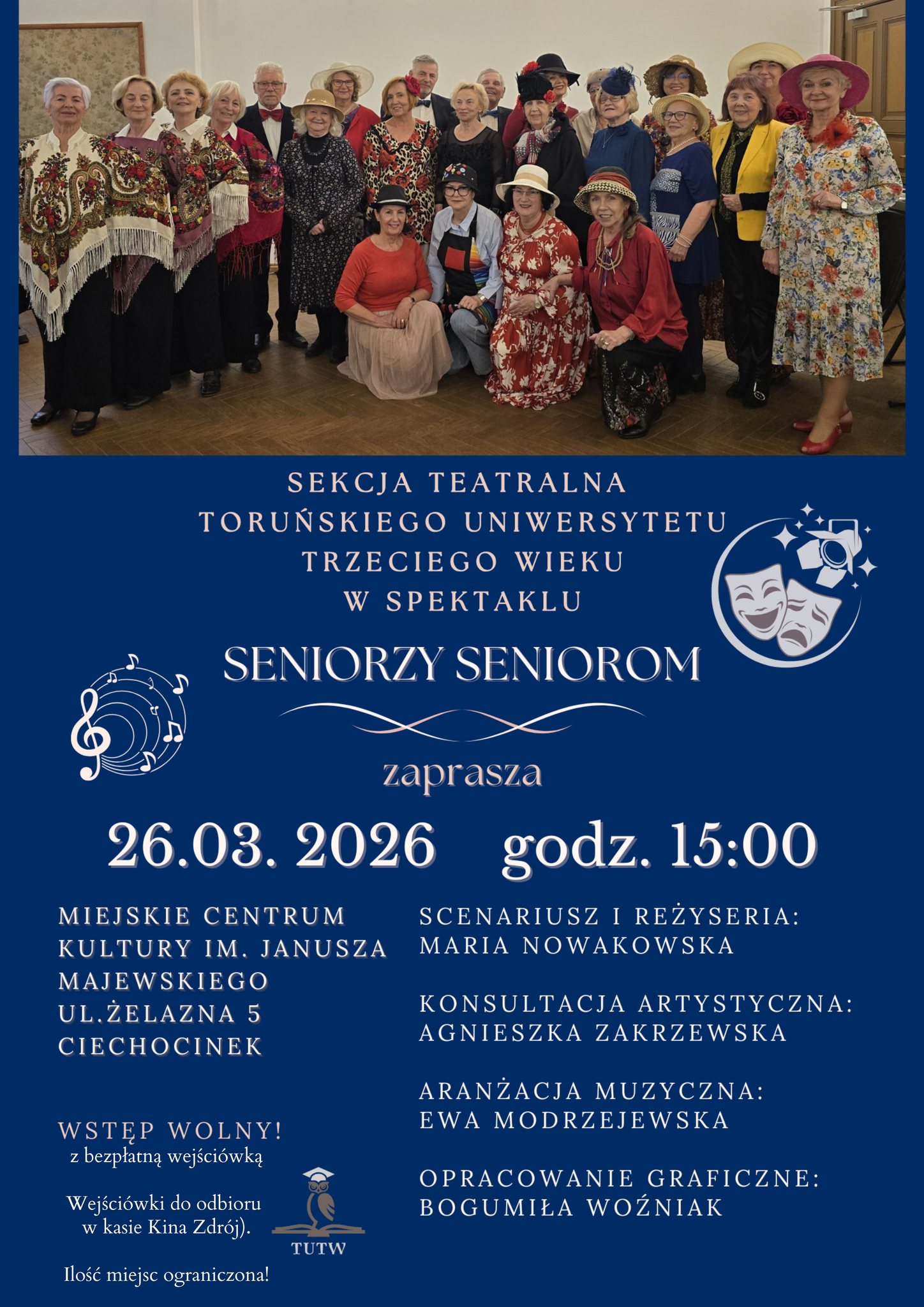 Zapraszamy na spotkanie z teatrem, które przygotowała Sekcja Teatralna Toruńskiego Uniwersytetu Trzeciego Wieku! Spektakl „Seniorzy Seniorom” to wydarzenie pełne humoru, muzyki i ciepła – stworzone przez seniorów dla seniorów, ale z pewnością znajdzie coś dla każdego. Na scenie wystąpią energiczni i pełni pasji artyści-amatorzy, którzy z ogromnym zaangażowaniem dzielą się swoją twórczością, doświadczeniem oraz radością […]