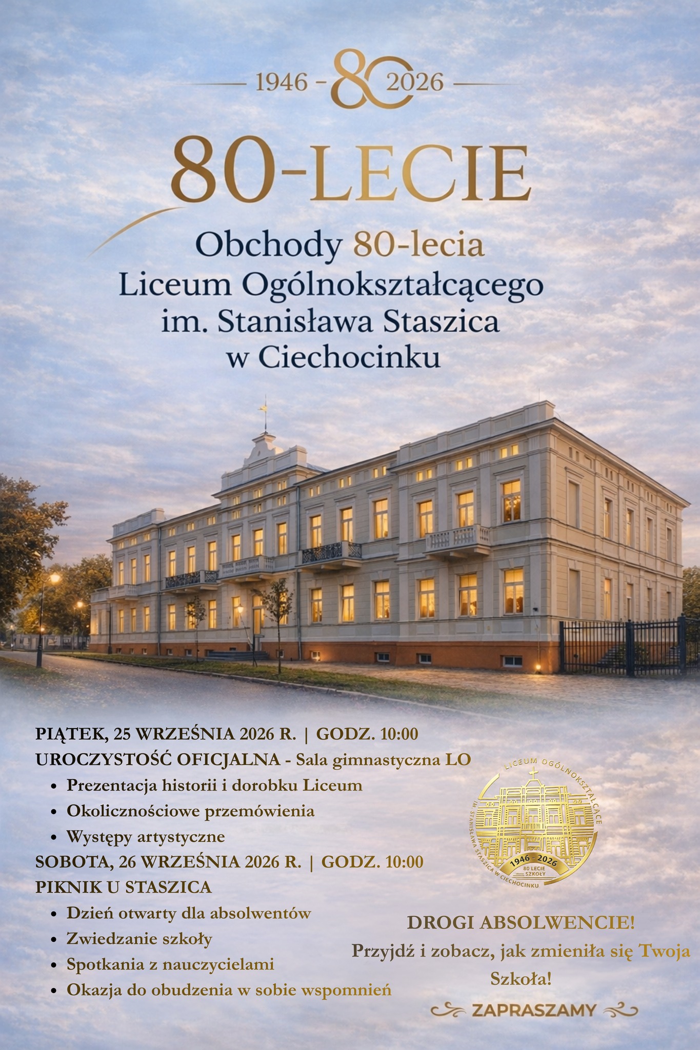 Liceum Ogólnokształcące im. Stanisława Staszica w Ciechocinku zaprasza mieszkańców, absolwentów, byłych nauczycieli i sympatyków szkoły do udziału w obchodach 80-lecia swojej działalności. We wrześniu tego roku minie dokładnie 80 lat […]